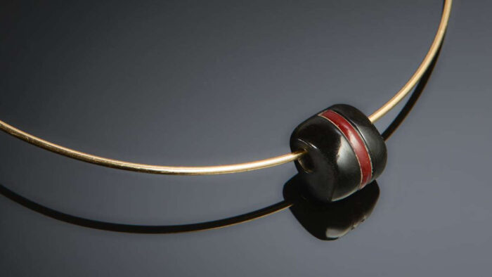 Fin dagli esordi volto alla semplificazione e pulizia della forma tradizionale e alla ricerca di nuovi cromatismi, l’orafo si spinge avanti: dapprima adottando severe geometrie, poi sondando le qualità plastiche delle pietre dure della sua terra, ossidiana, fluorite, ametista, calcedonio perché, diceva, “sono pietre ‘pure’, incapaci di turbare la neutralità dell’analisi”. Così, le rende protagoniste, sospese di volta in volta a fili d’oro o argento, studiando tutte le varianti del rapporto tra pieno e vuoto, positivo e negativo. Il recupero di questi materiali, cosiddetti “poveri”, fino all’uso del plexiglass, implica anche il rifiuto di considerare l’ornamento quale simbolo di ricchezza e di status sociale, bensì uno strumento di comunicazione concepito in relazione al corpo, che si muove e dialoga con esso, come i suoi famosi mono-orecchini.